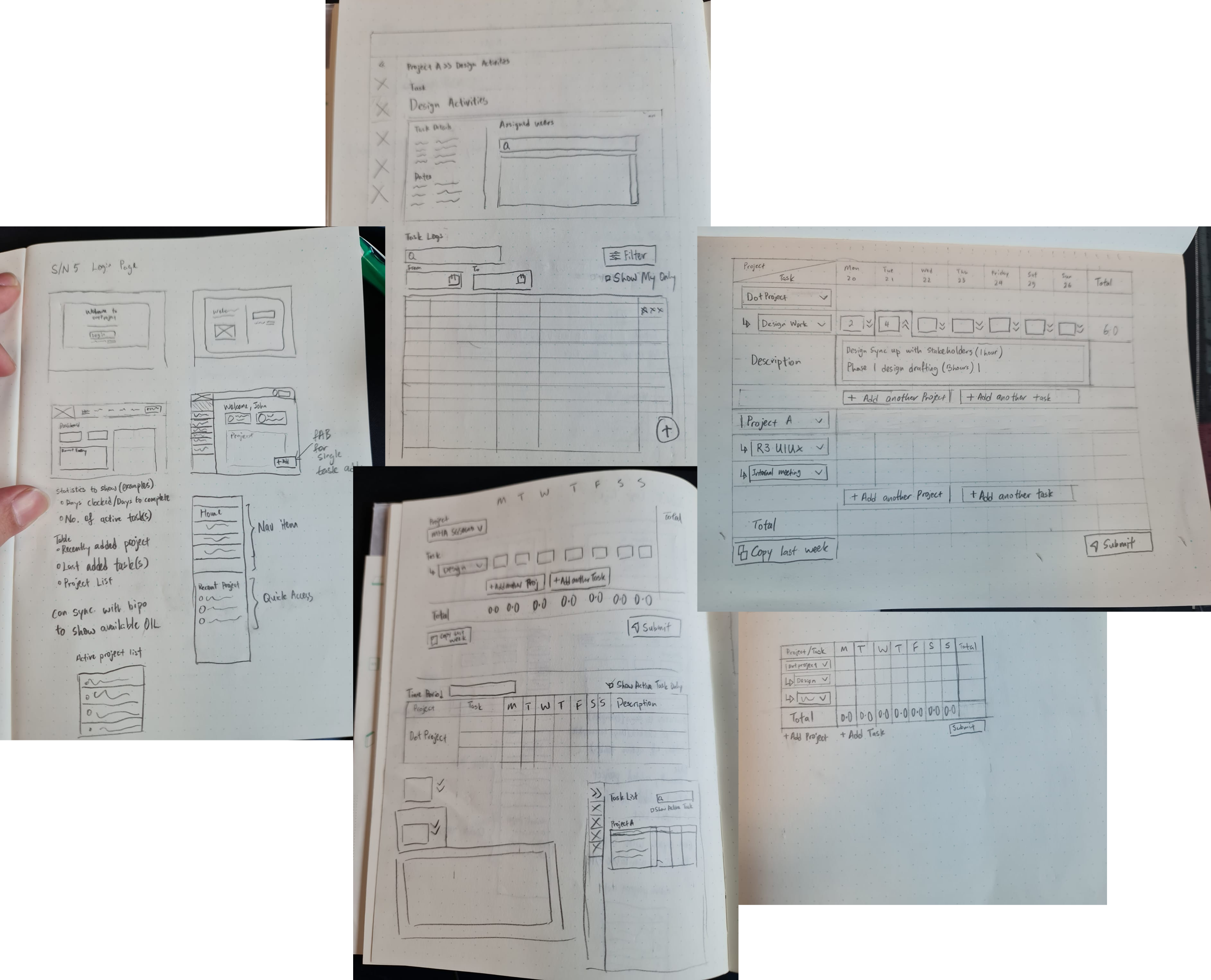 I begin the ideation process by listing out different possible solutions to pain points mentioned in the user interviews, mainly focusing on how we can minimise the visual load to improve how they navigate the page and simplify how staff member submit their timesheet.